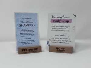 We have added a NEW really cool product! The card holder is great for holding anything from business cards, soap information cards, candle information cards, SALE posts and so much more. They come with a personalized engraving on each holder (one side). Check them out in our wholesale products.