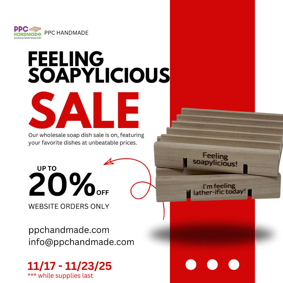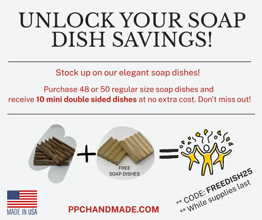 Check out our SALE! Buy 48 or 50 of our regular soap dishes (excludes the SALE product), and get 10 FREE mini double sided soap dishes! Sale ends 11/15/25 or until we are out of the mini double sided soap dish.