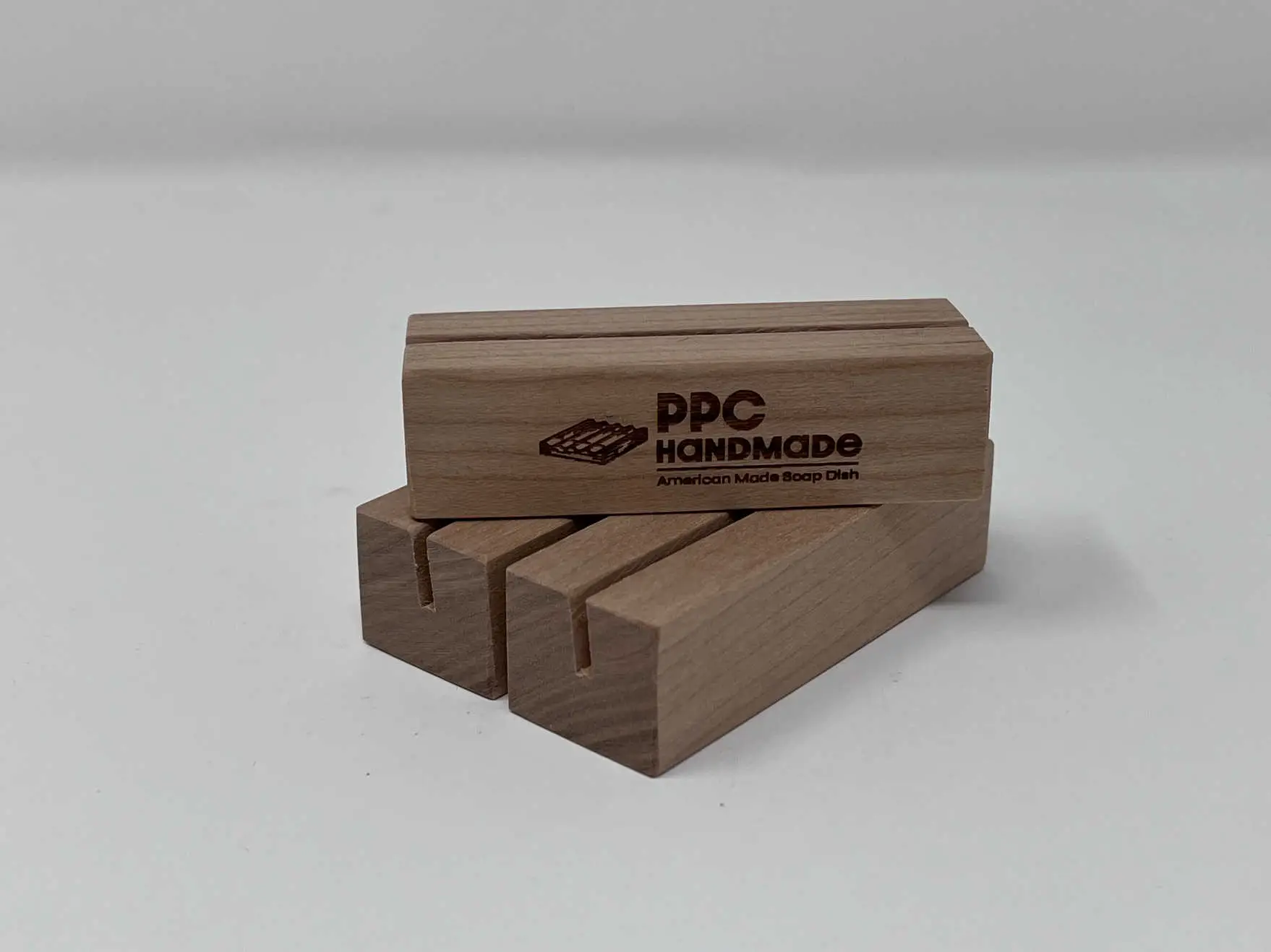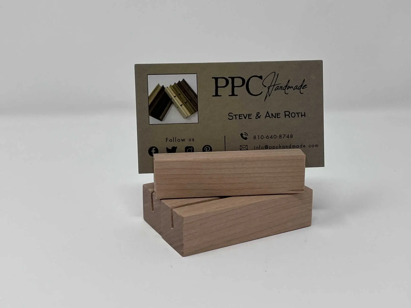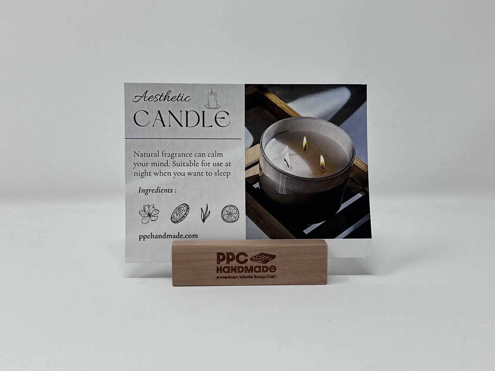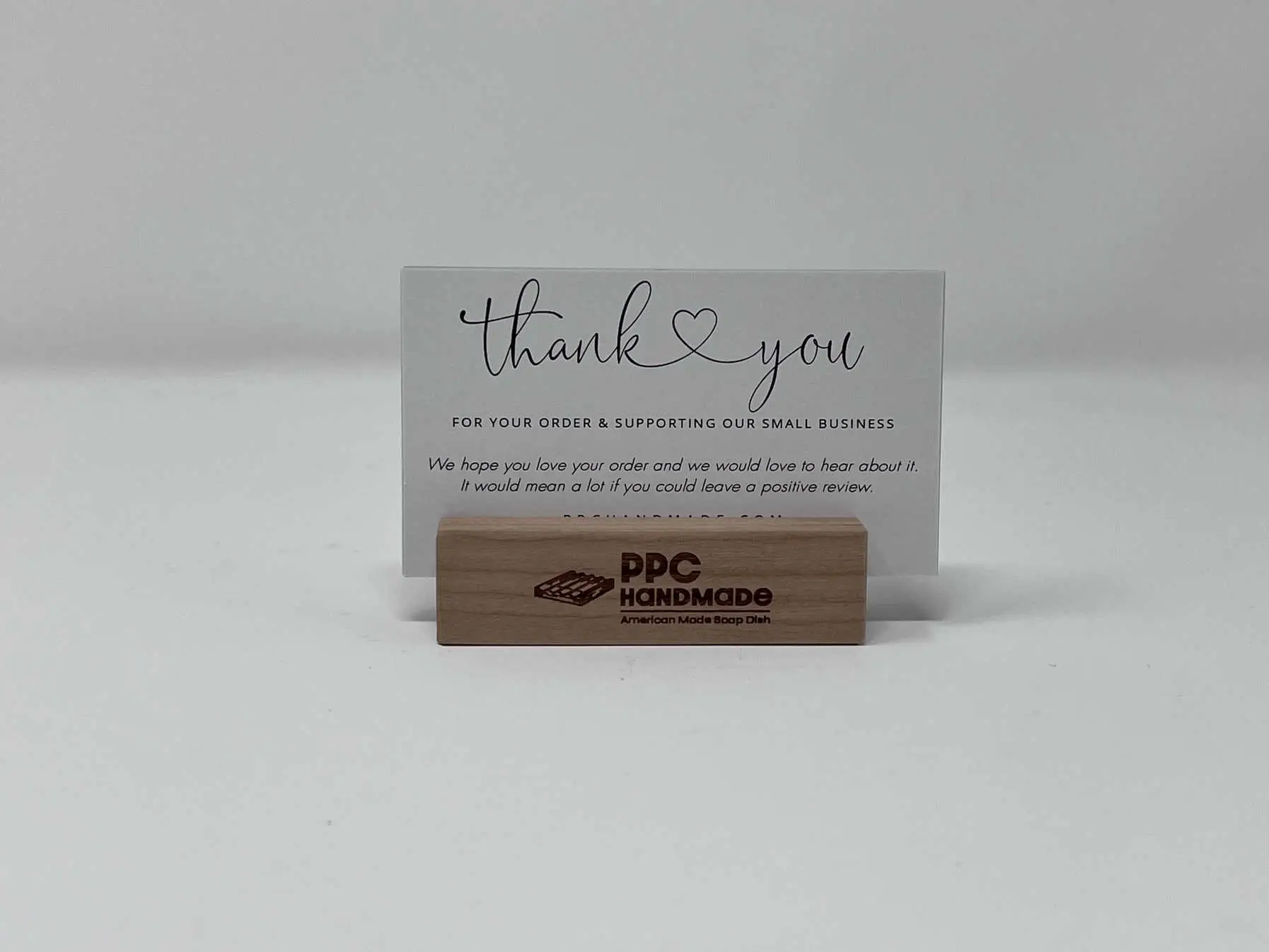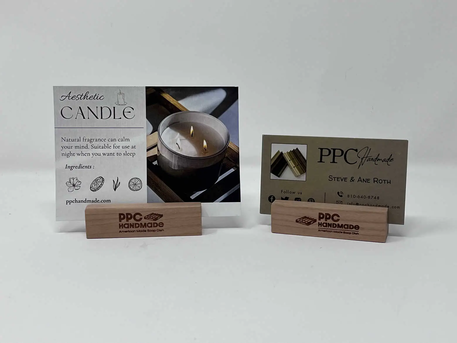 Our card holders are made of 100% natural cherry wood with beautiful darker color. We hand sand all the edges on each card holder, therefor creating a soft elegant look and feel. Each holder is engraved with your personalized information or logo. They measures about 2.7” by 0.9” by 0.75” tall. Great size for displaying soap or candle card info next to the soaps or candles at shows or markets. Each holder holds about 5 business cards.